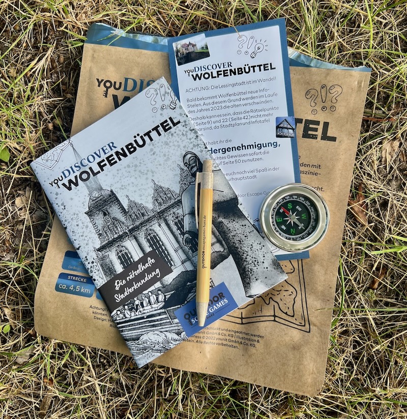 Am zweiten Tag starte ich mit einer besonderen Stadterkundung: „You Discover Wolfenbüttel“, ein Outdoor-Escape-Game. Mit Kompass und Anleitungsheft löse ich Rätsel, entdecke versteckte Gassen, historische Gebäude und kleine Plätze. Die Tour dauert rund vier Stunden und lässt sich flexibel gestalten – perfekt, um Wolfenbüttel individuell zu erleben.