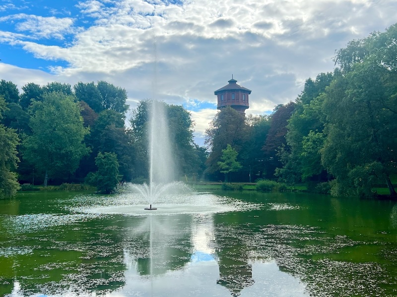 Auf meinem Rückweg schlendere ich am Stadtgraben Wolfenbüttel entlang. Früher Teil der Stadtbefestigung, ist er heute ein grüner Spazierweg mit Wasserturm und Fontäne. Im Seeliger Park mit seinen alten Bäumen finde ich Ruhe, bevor ich ins Jugendgästehaus Wolfenbüttel zurückkehre.